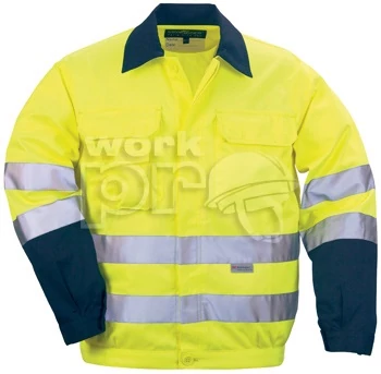 • jól láthatósági sárga vagy narancs szín, sötétkék kontraszt alapanyagú gallér, kézelő, váll, könyök, térd, lábszár és ülep (szennyeződéseknek jobban kitett részek)