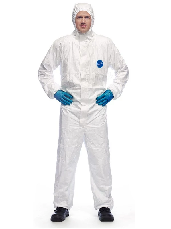 - Tyvek 1431N polietilén anyagú (41 g/m2), fehér, kapucnis védőoverall